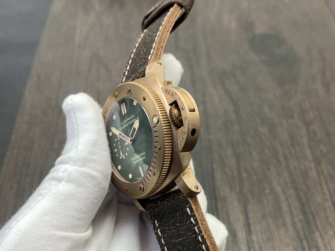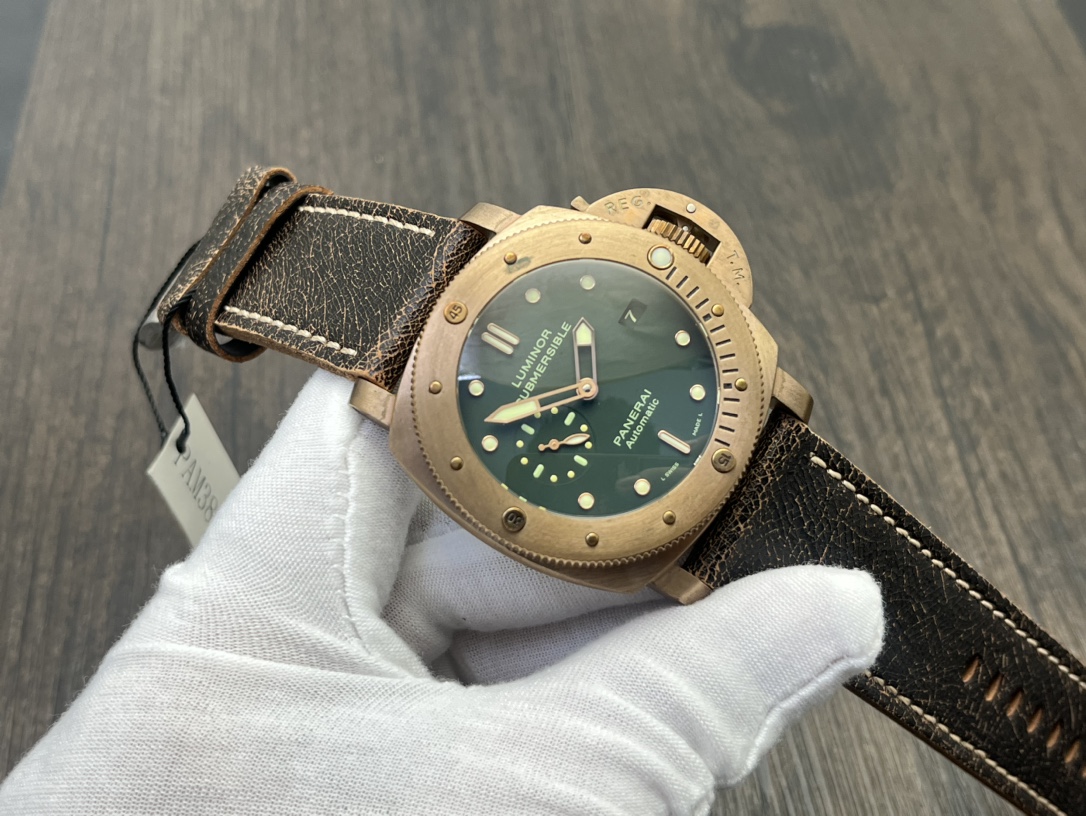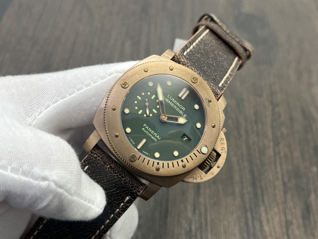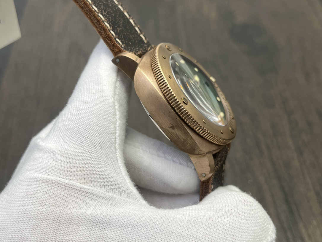 Panerai Submersible Automatic 47mm Green Dial Bronze Case Leather Strap Men’s Watch