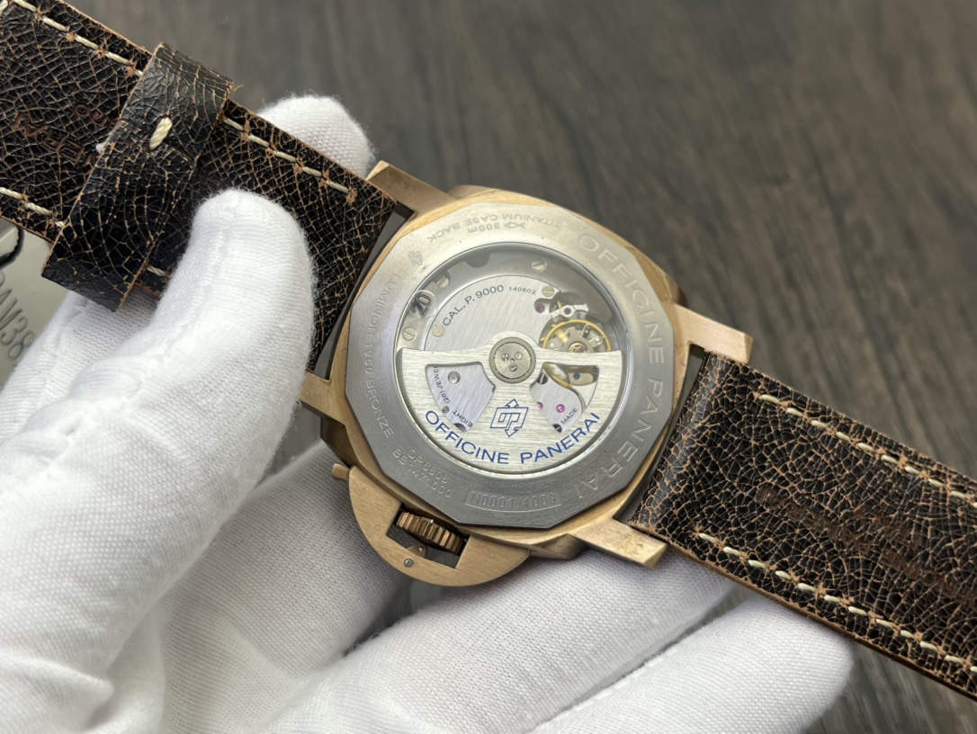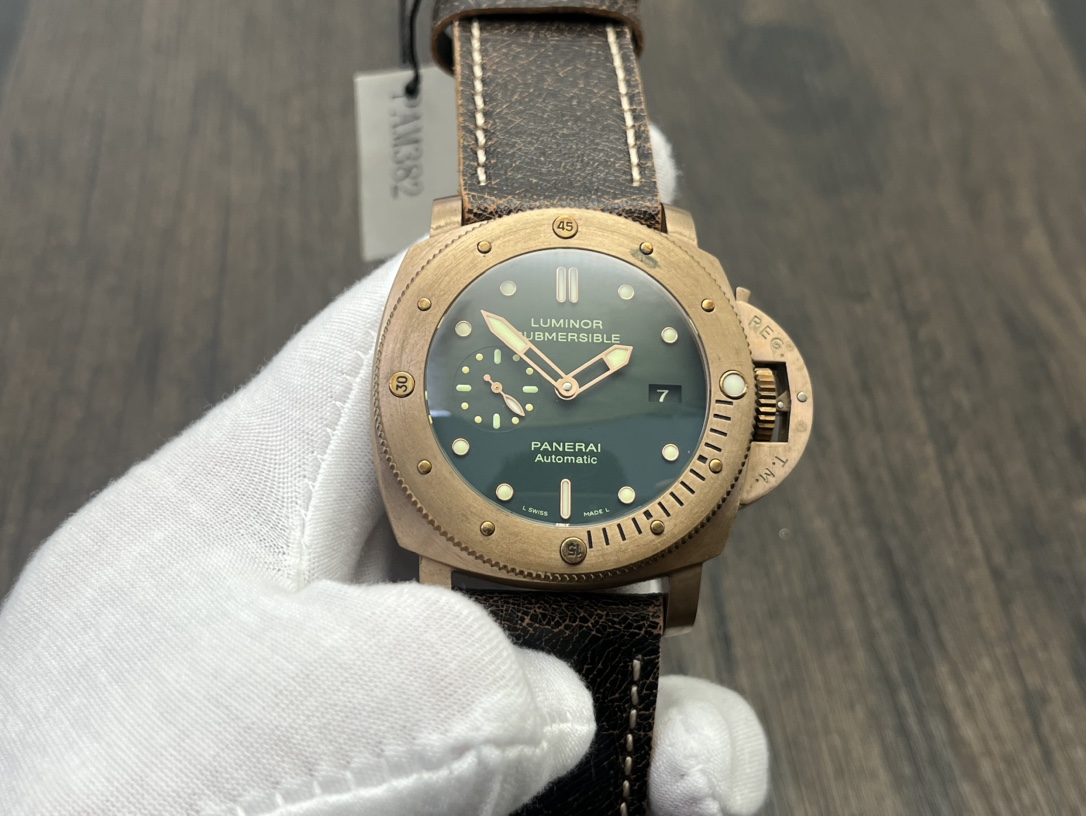 The Panerai Submersible PAM00382 features a 47mm brushed bronze case with a striking green dial, designed for adventurers who value heritage and toughness. Powered by the automatic P.9000 movement, it delivers precision and durability. The transparent caseback reveals a beautifully finished rotor and balance wheel, while the 300m water resistance ensures uncompromising reliability. A brown leather strap completes this masculine, vintage-inspired timepiece.