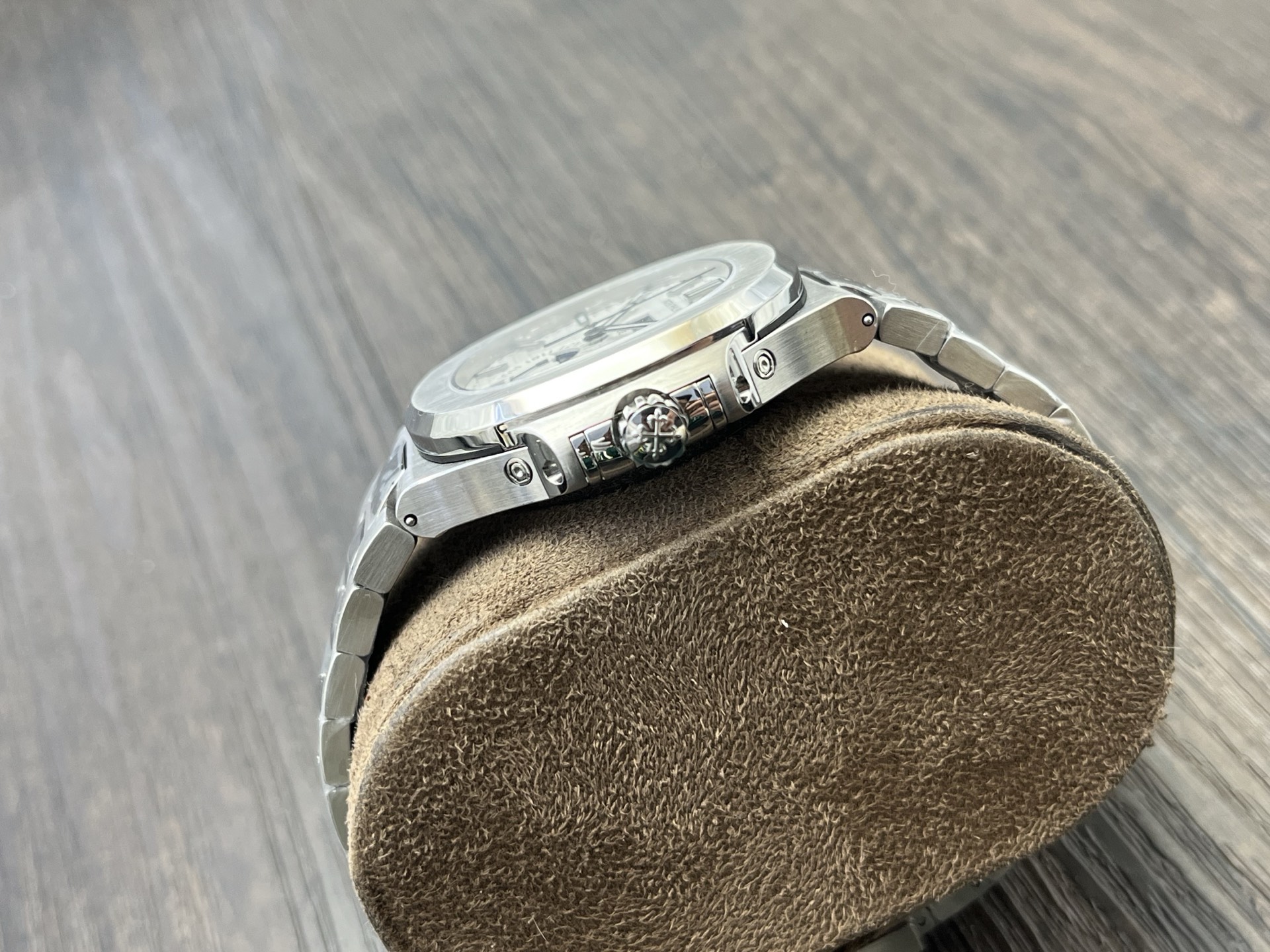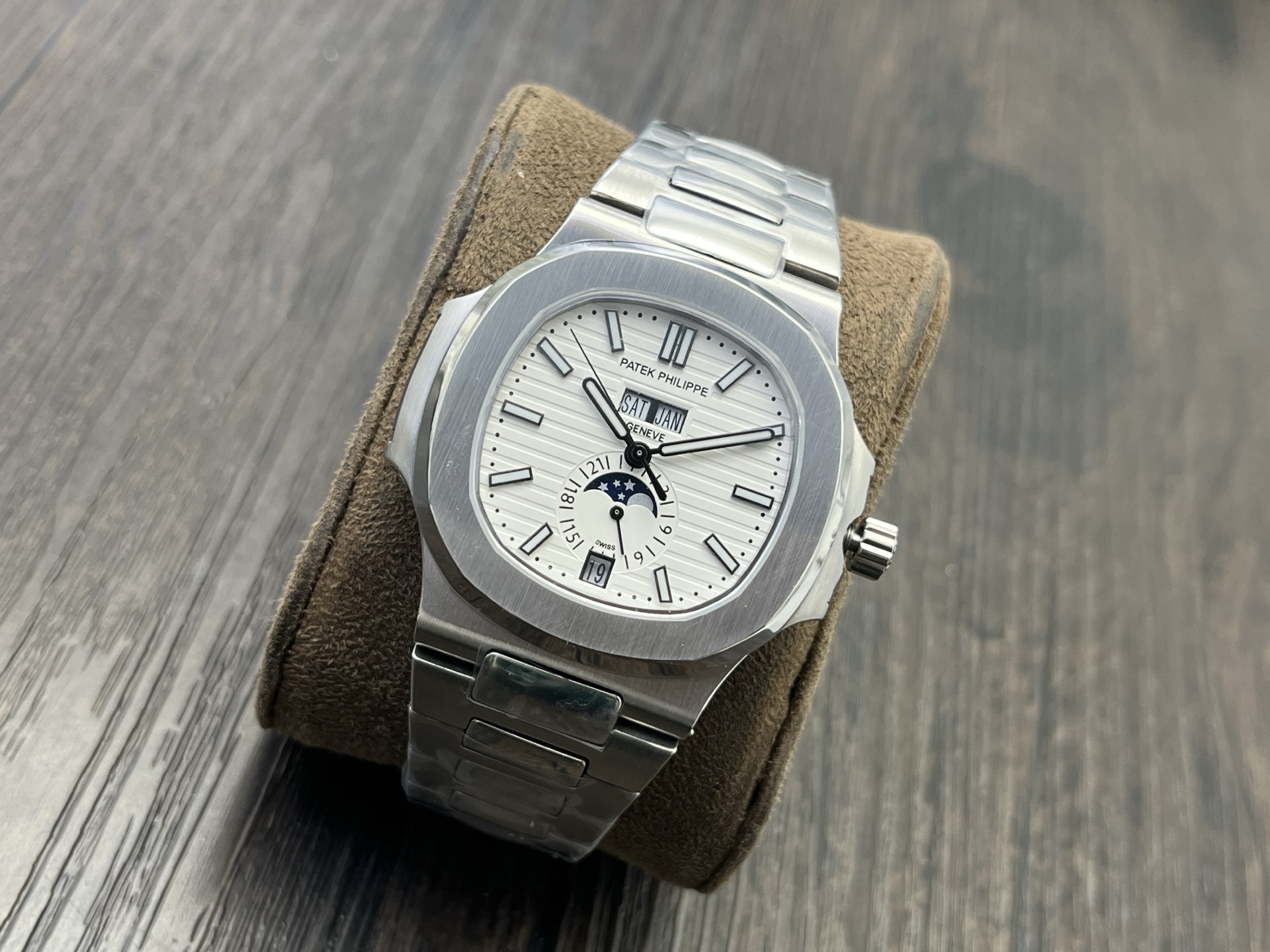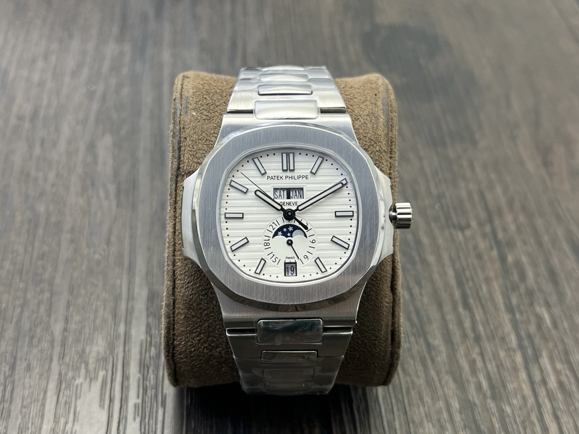 The Patek Philippe Nautilus 5726 combines iconic design with mechanical sophistication. Powered by the Caliber 324 S QA LU 24H/303 automatic movement, it features an annual calendar, moonphase display, and 24-hour indicator. The 40.5mm stainless steel case pairs with a sapphire crystal featuring dual-sided anti-reflective coating. With 120m water resistance, a horizontal embossed dial that fades from light to dark, and exquisite polishing, this model embodies Patek Philippe’s unparalleled craftsmanship and timeless Nautilus elegance.