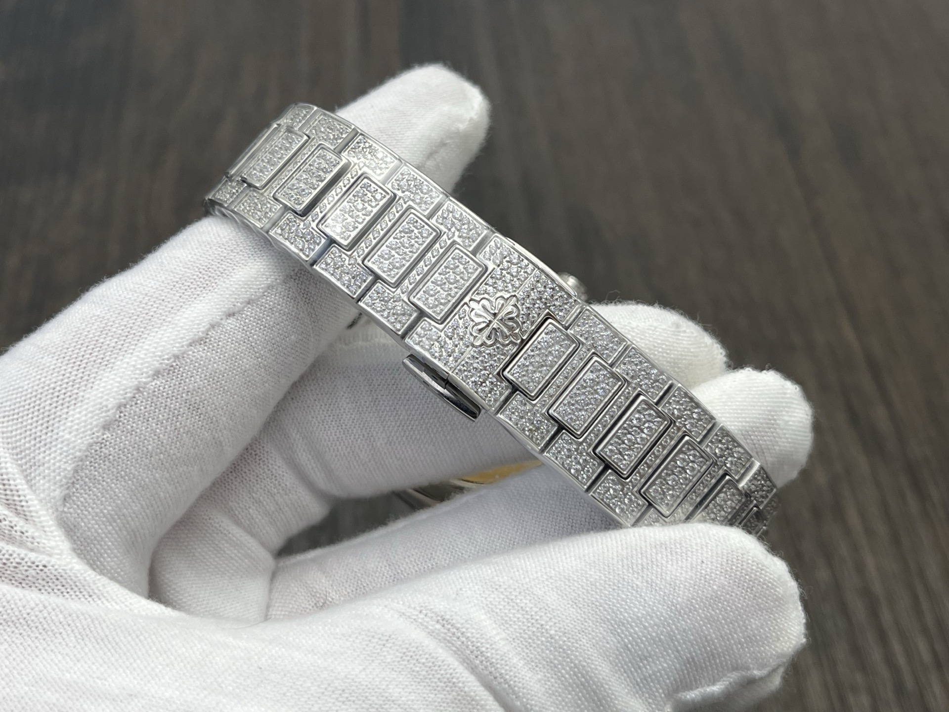 Patek Philippe Nautilus Ladies Automatic 35.2mm Full Diamond White Gold from the Patek Philippe Nautilus Ladies Full Diamond Collection is a masterpiece of fine watchmaking and jewelry craftsmanship. The watch showcases the brand’s signature snowflake diamond-setting technique, featuring over 2,500 natural brilliant-cut diamonds meticulously embedded across the case, bezel, dial, and bracelet. The white diamond-set dial alone holds 286 dazzling diamonds with a date window at 3 o’clock, while the white gold case is adorned with 518 stones for an extraordinary sparkle. Its integrated diamond-set bracelet continues the brilliance with 1,700+ precisely placed gems, giving the illusion of seamless metal and light.