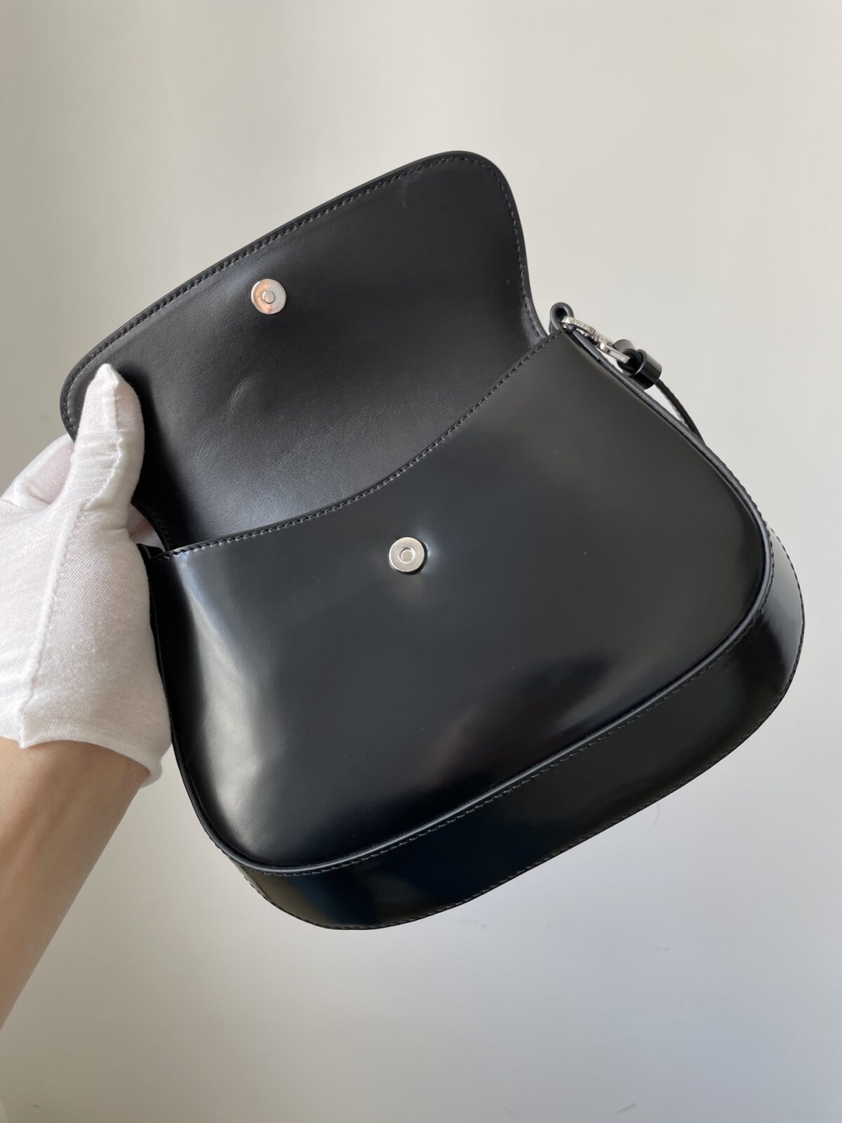 PRADA Cleo Glossy Leather Shoulder Bag Black crafted from Glossy Leather. Features magnetic flap closure and interior slip pocket.