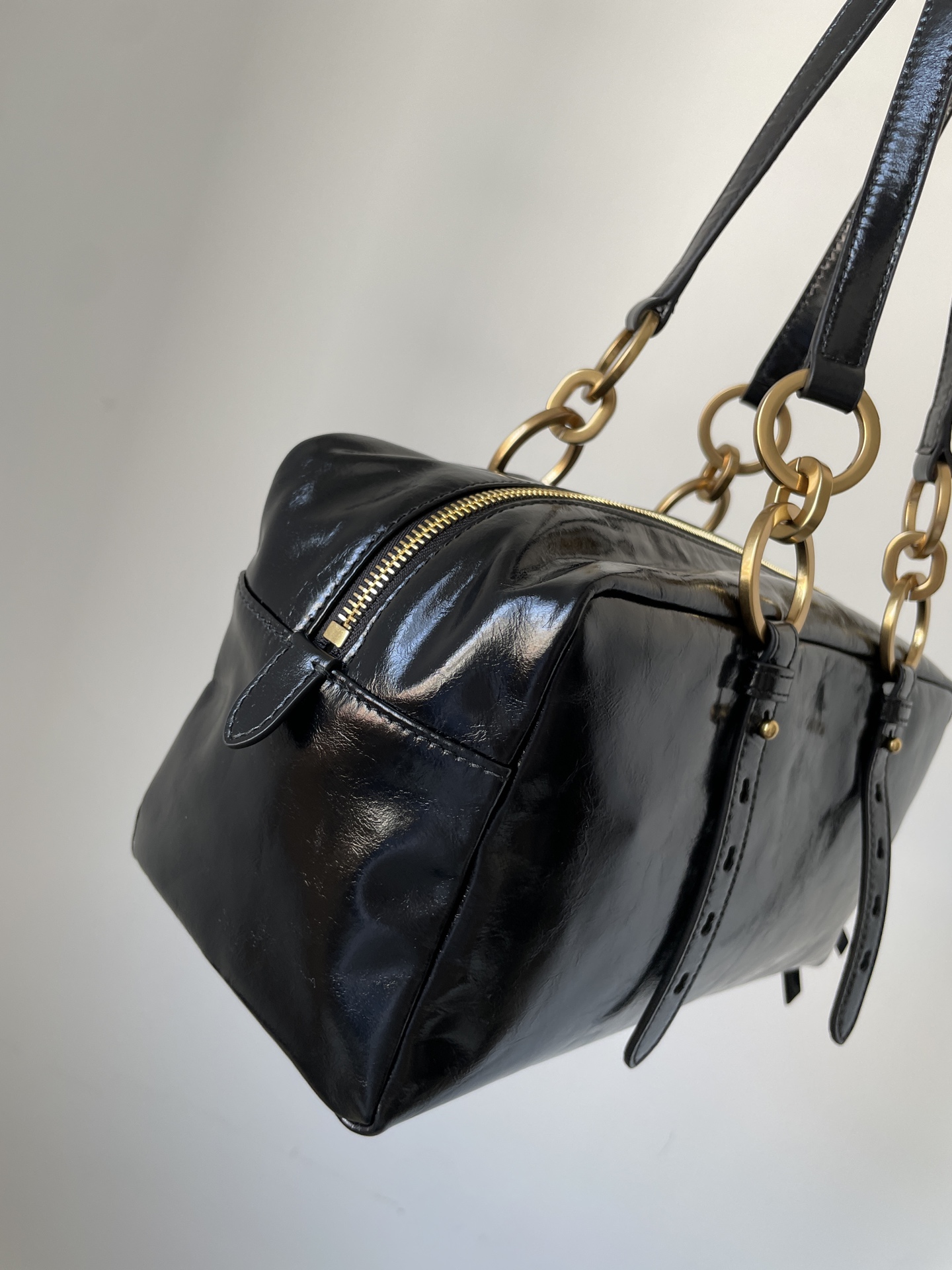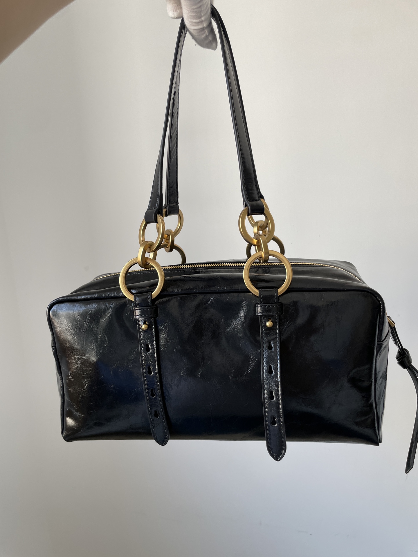 The PRADA Dangle Logo Medium Leather Shoulder Tote Bag Black unites technical innovation with timeless luxury. Crafted from Calf Leather with a refined hand and durable finish. Accented by Prada’s signature enameled triangle logo, it balances refined aesthetics with everyday practicality.