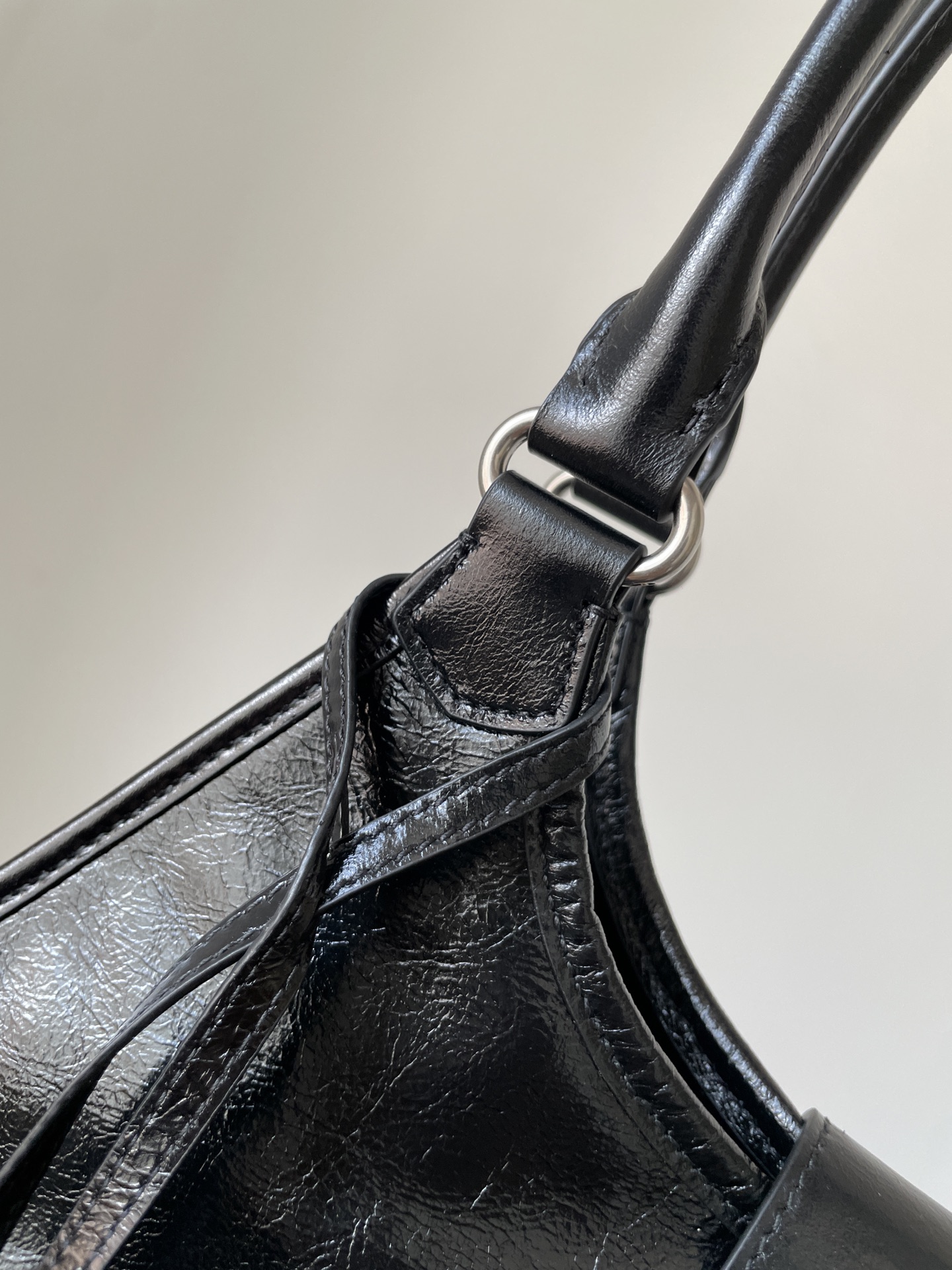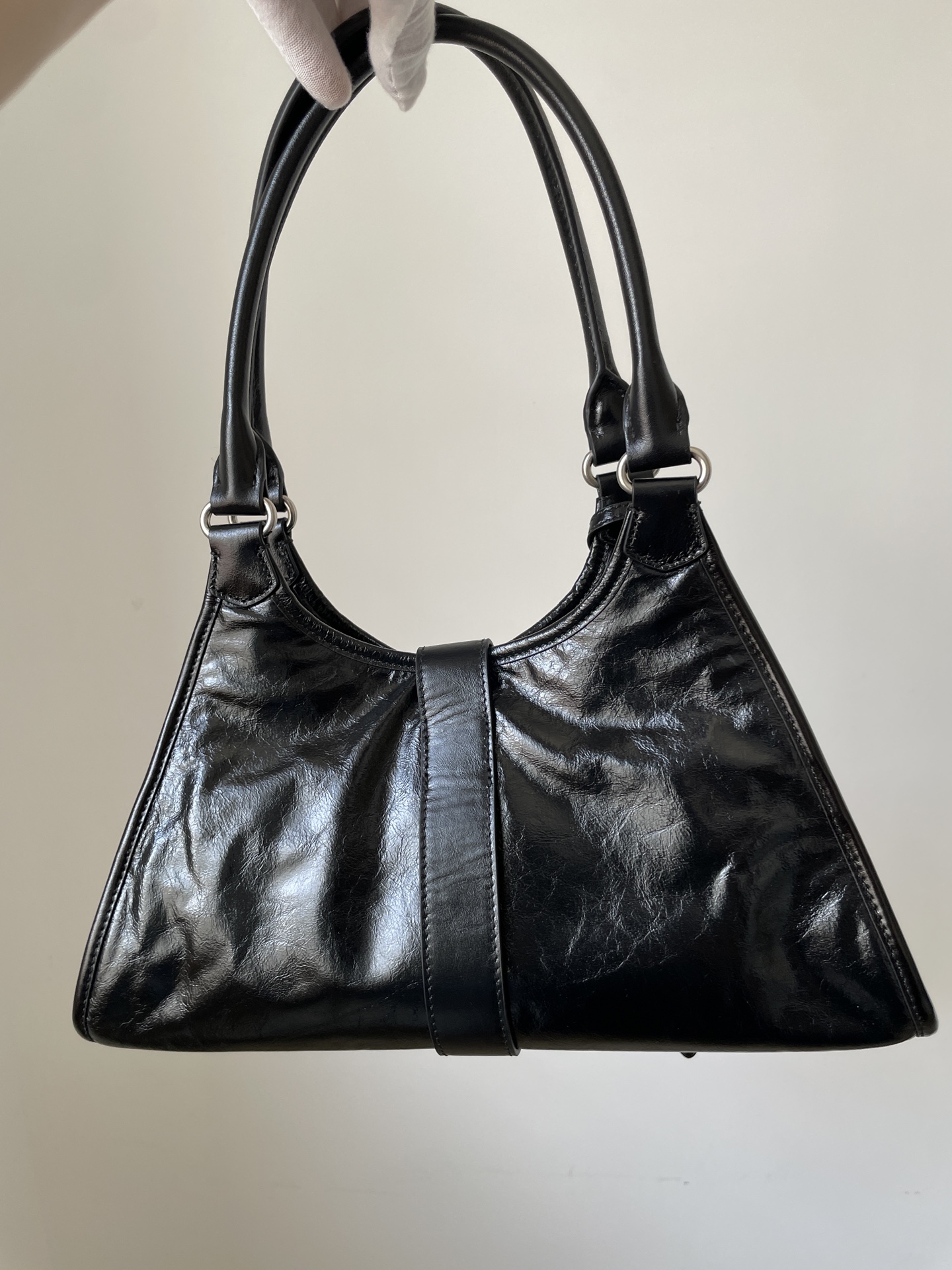 - Carry/Strap: Leather top handles (25 cm drop); detachable leather mirror charm