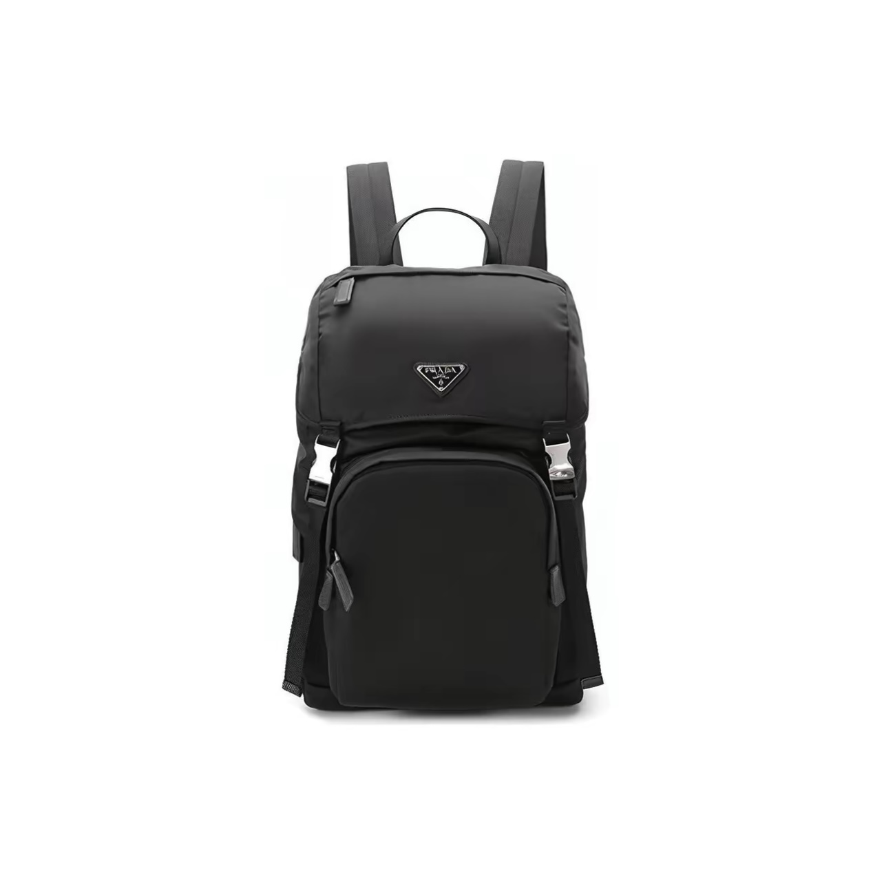 Prada Re-Nylon Drawstring Buckle Backpack Black made from Re-Nylon + Saffiano Leather. Features Four exterior zips and flap with buckle.
