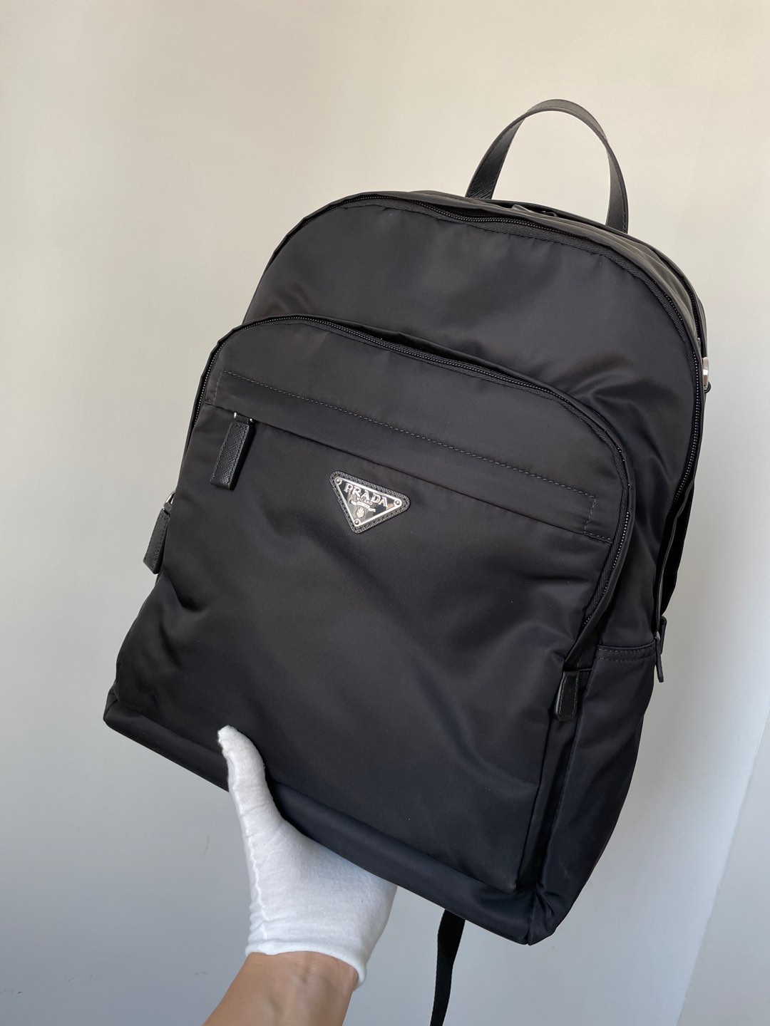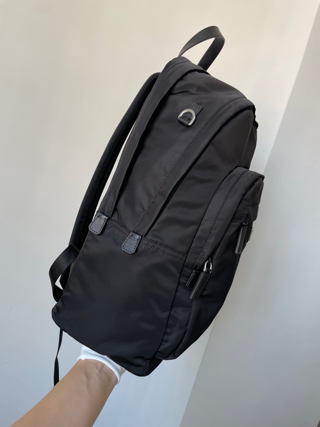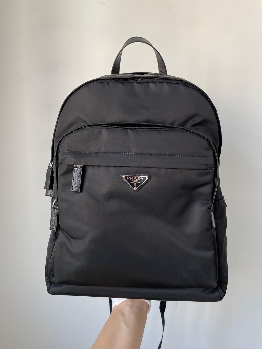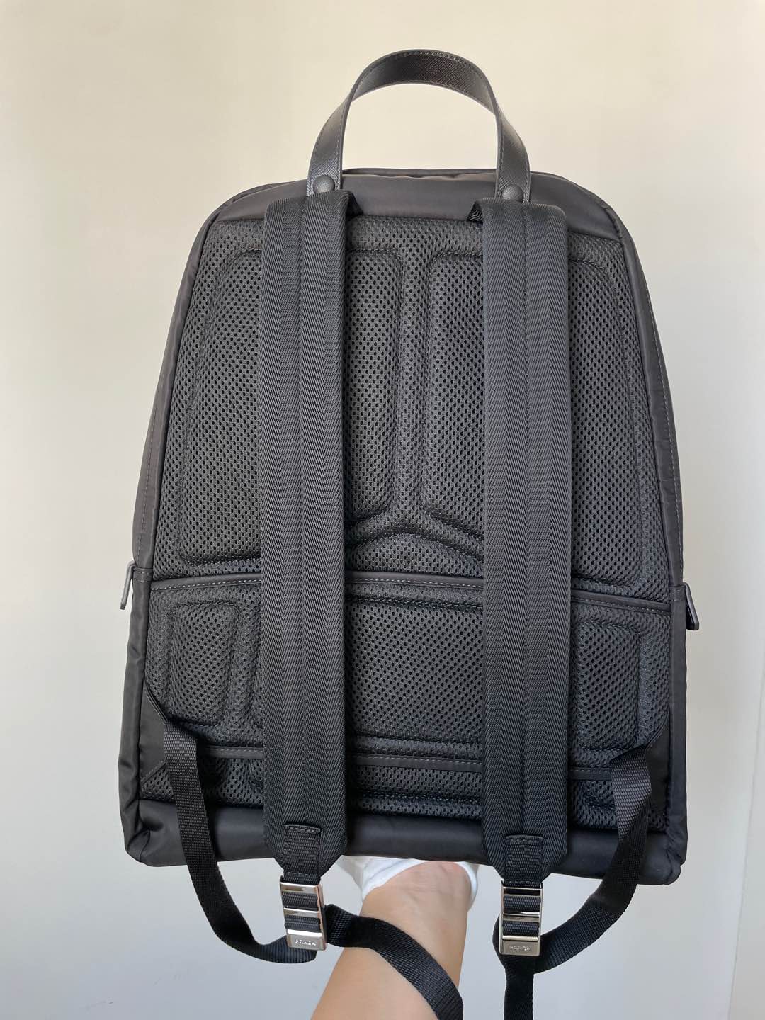 Prada Re-Nylon & Saffiano Leather Backpack Black made from Re-Nylon + Saffiano Leather. Features Two main zips and dual top zips.