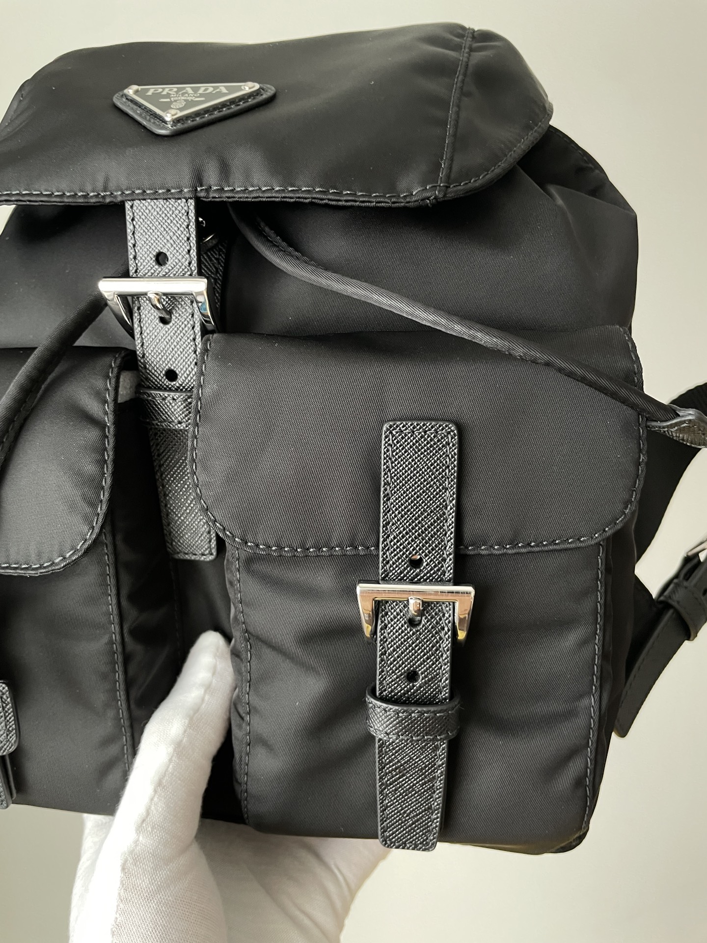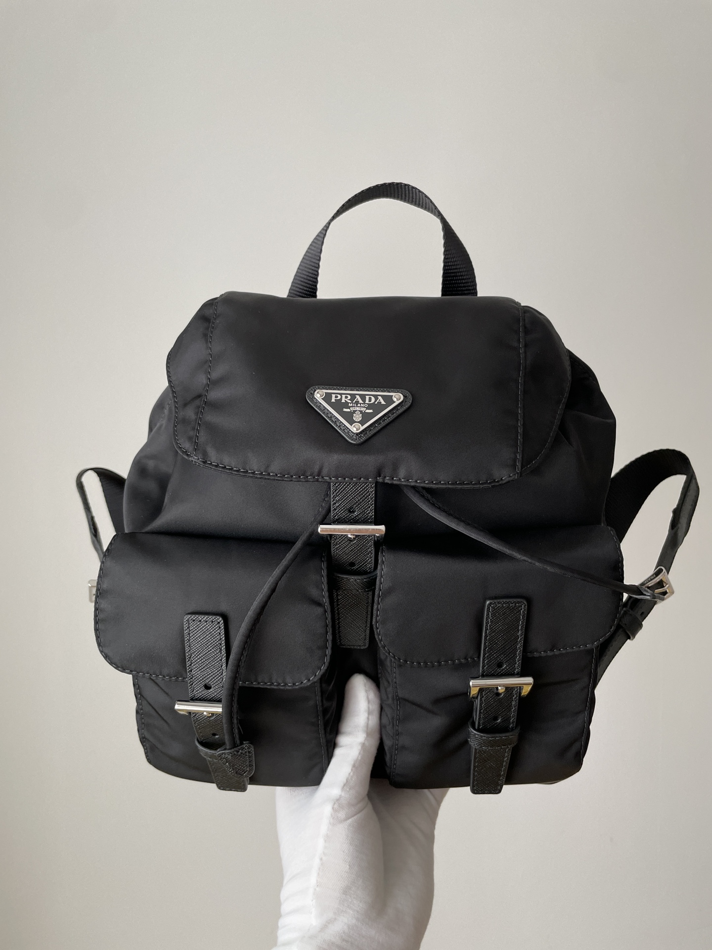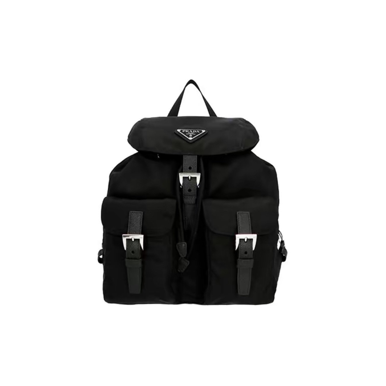 PRADA Re-Nylon Small Backpack with Triangle Logo Black crafted from Re-Nylon & Saffiano Leather. Features drawstring with flap and buckle and front flap pocket.