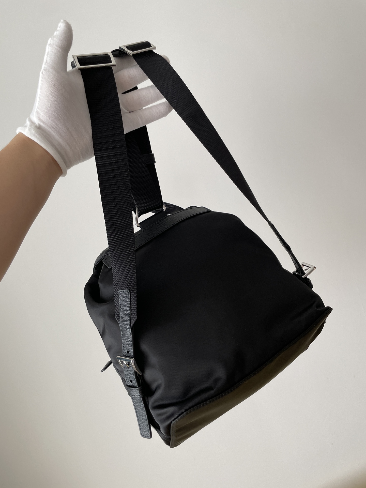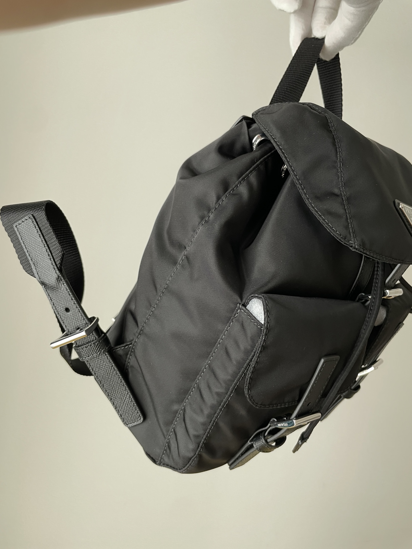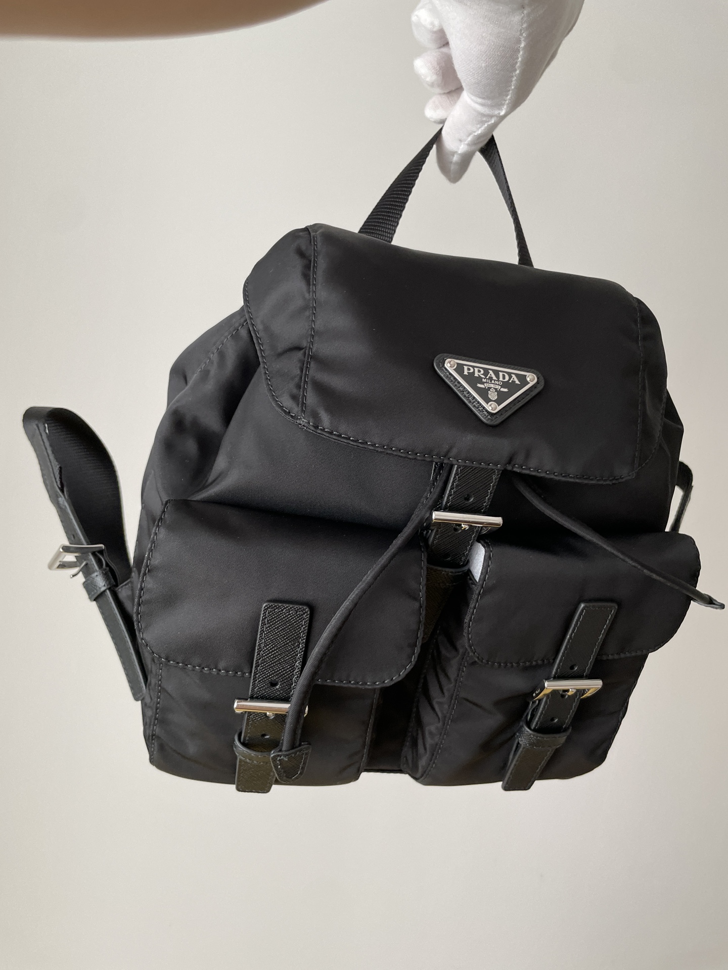 PRADA Re-Nylon Small Backpack with Triangle Logo Black crafted from Re-Nylon & Saffiano Leather. Features drawstring with flap and buckle and front flap pocket.