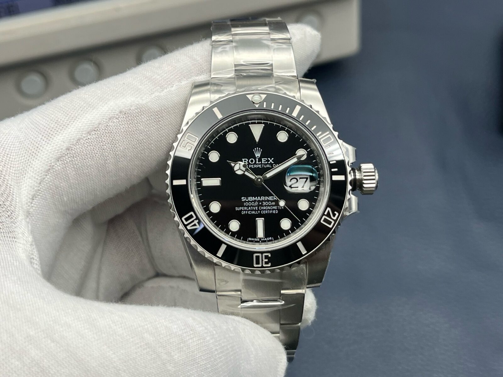 Rolex Submariner 41mm Black dial with Oystersteel case and 300 m water resistance.