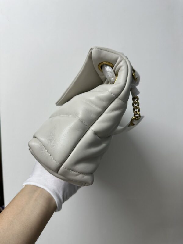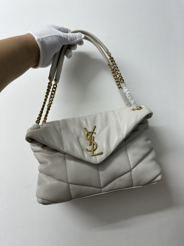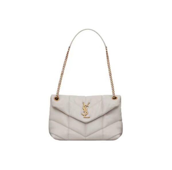 The Saint Laurent LOULOU PUFFER bag is crafted from ultra-soft quilted lambskin with the iconic YSL logo in light bronze. Envelope-style flap with magnetic snap closure, one interior zip pocket, and adjustable chain strap. Cotton lining. Dimensions: 29 x 17 x 11 cm. Chain drop: 28 – 52 cm.