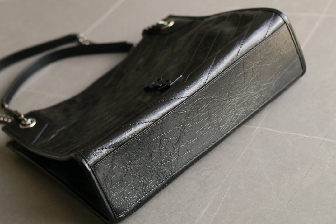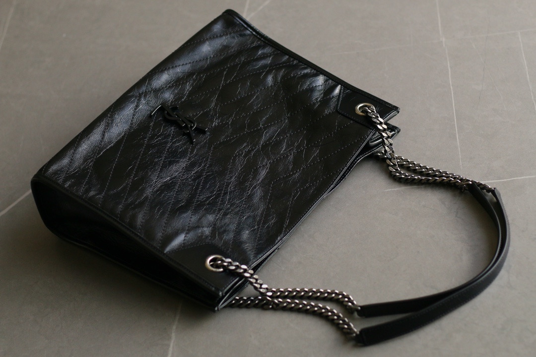The Saint Laurent Niki Large tote bag is made from crinkled vintage calfskin, featuring V-shaped stitching and the leather-covered YSL logo. Lightweight, with a roomy interior and sliding chain strap for shoulder or crossbody wear. Magnetic closure and zip inner pocket. Dimensions: 33 x 27 x 11.5 cm. Chain drop: 27 – 47 cm.