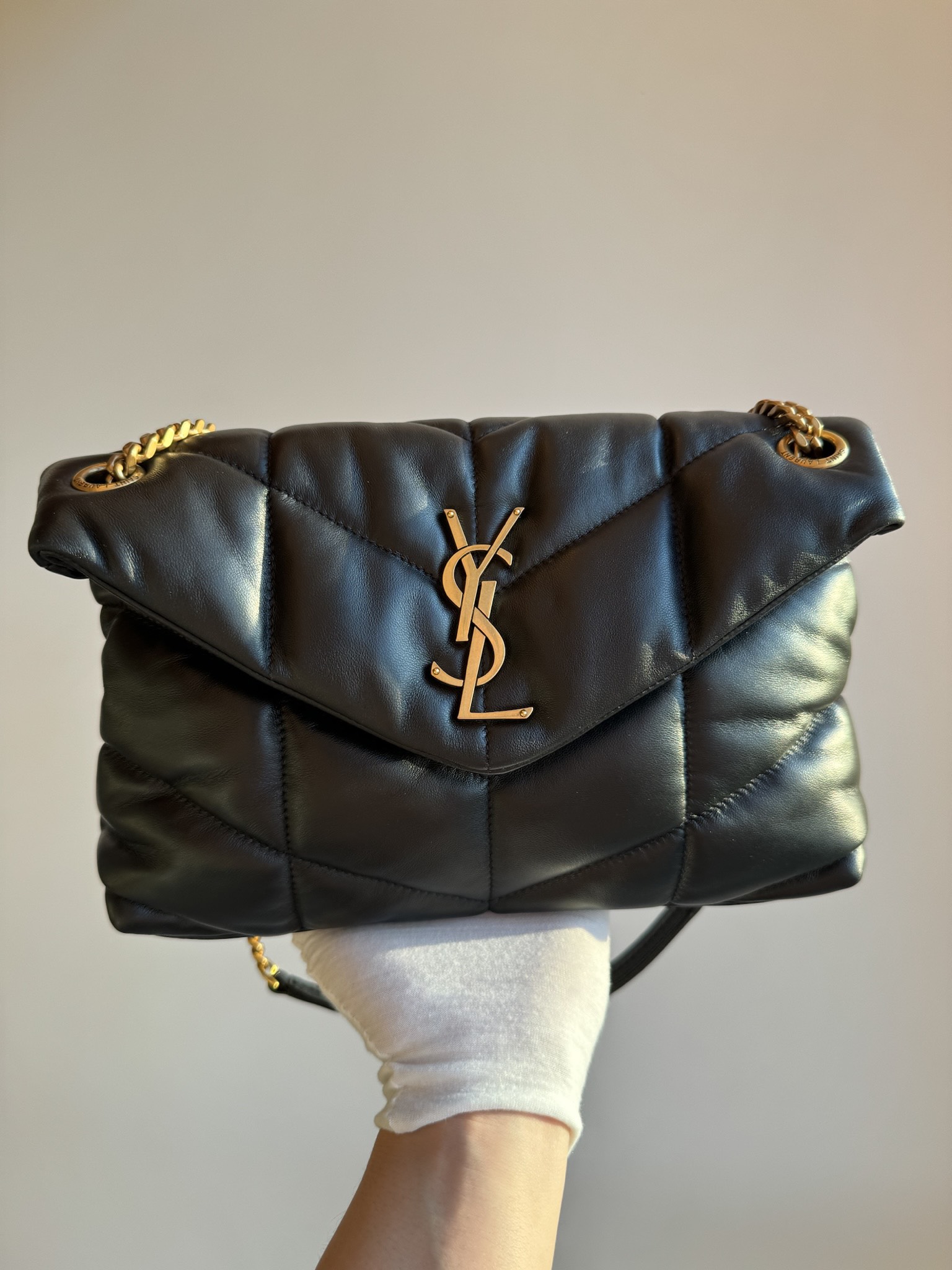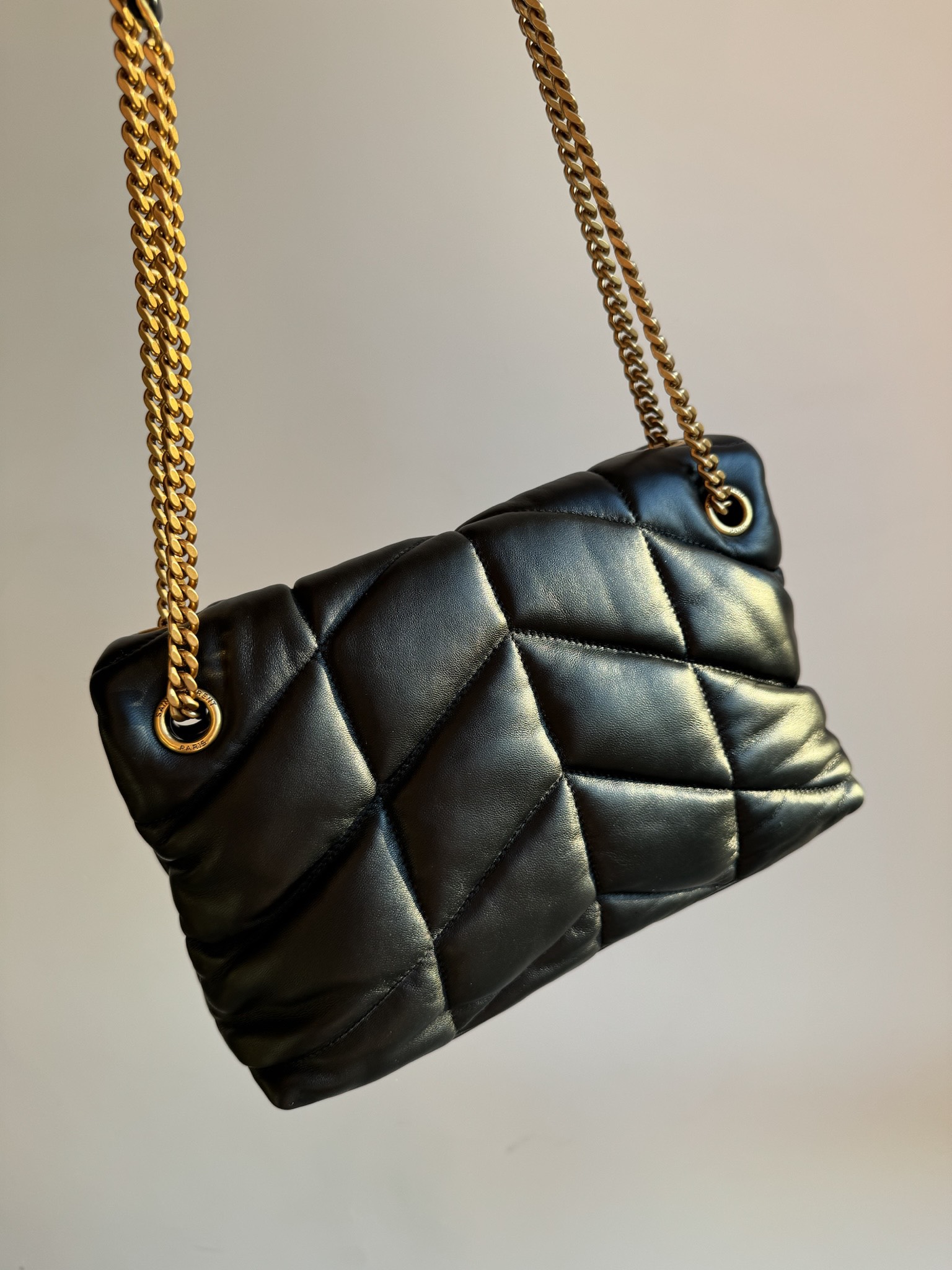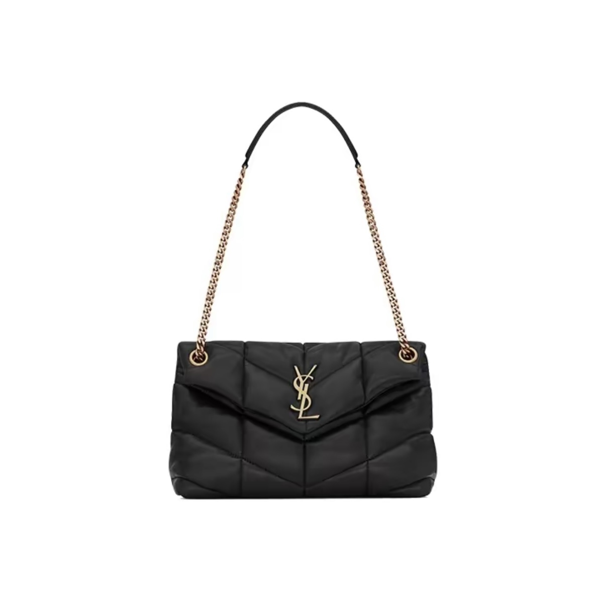 The YSL PUFFER small shoulder bag features ultra-soft lambskin with V-shaped quilted stitching and a YSL logo in antique bronze metal. Magnetic closure and inner zip pocket. Cotton lining. Can be worn crossbody or on the shoulder. Dimensions: 29 x 17 x 11 cm. Chain drop: 28 – 52 cm.