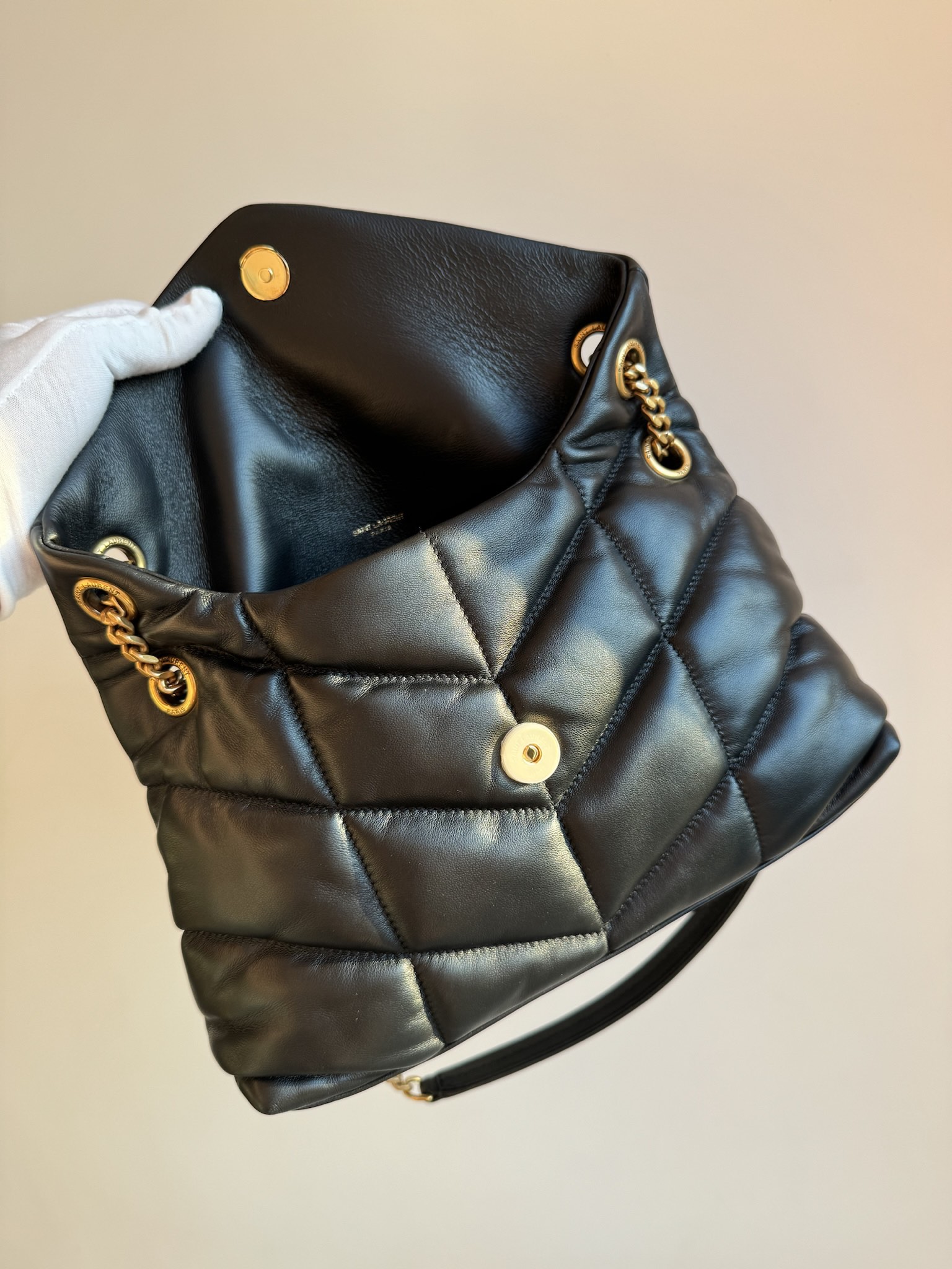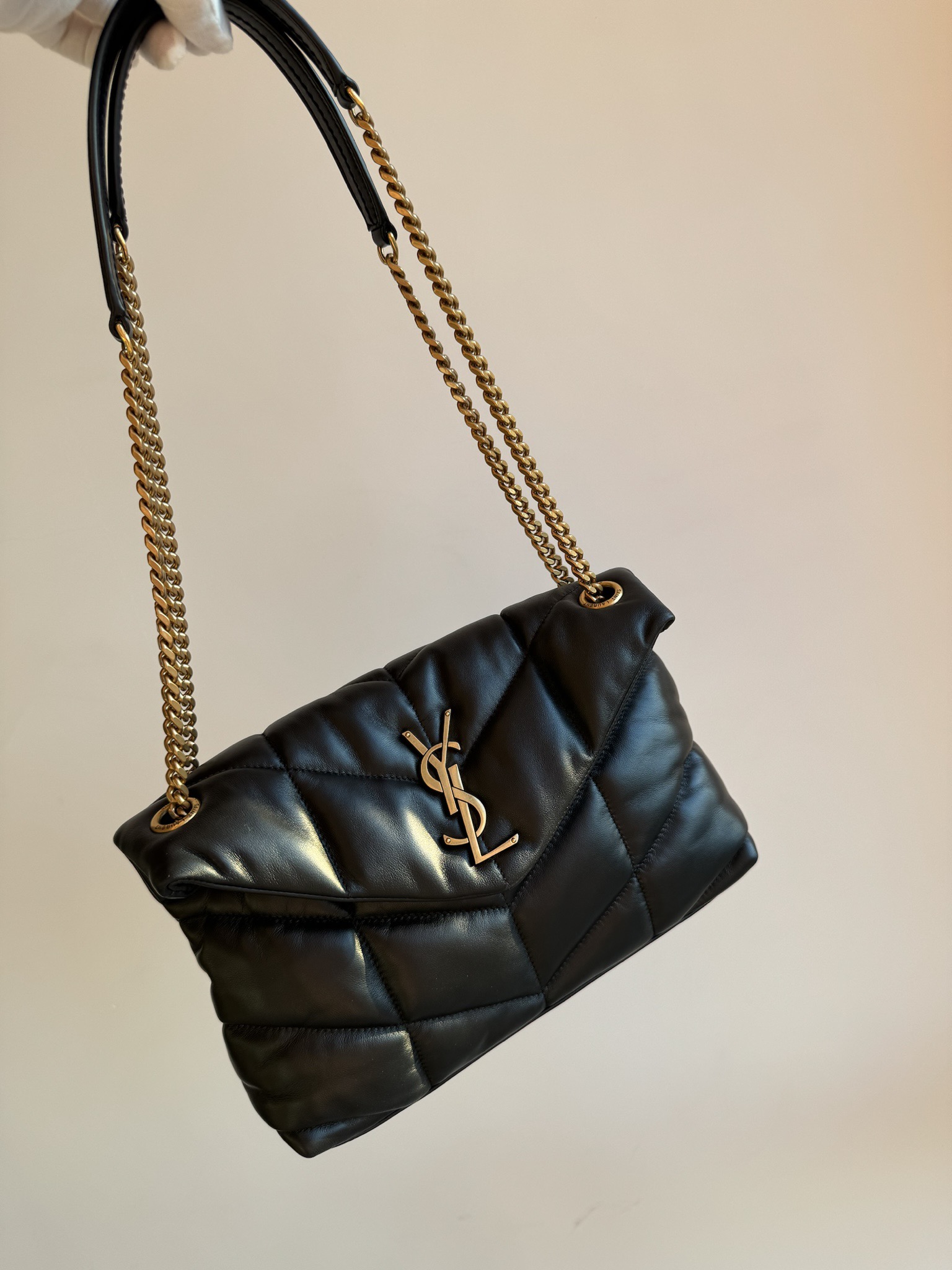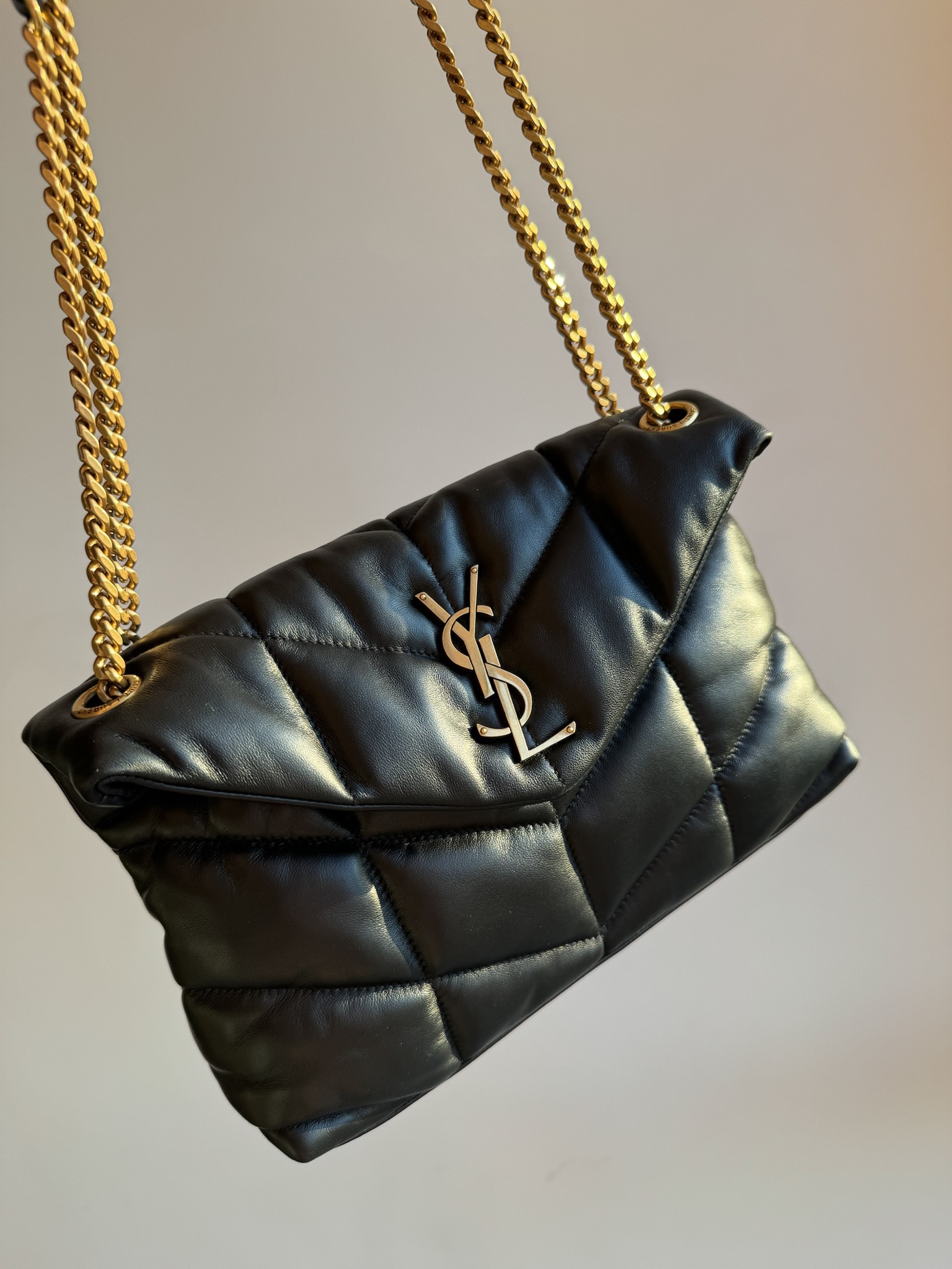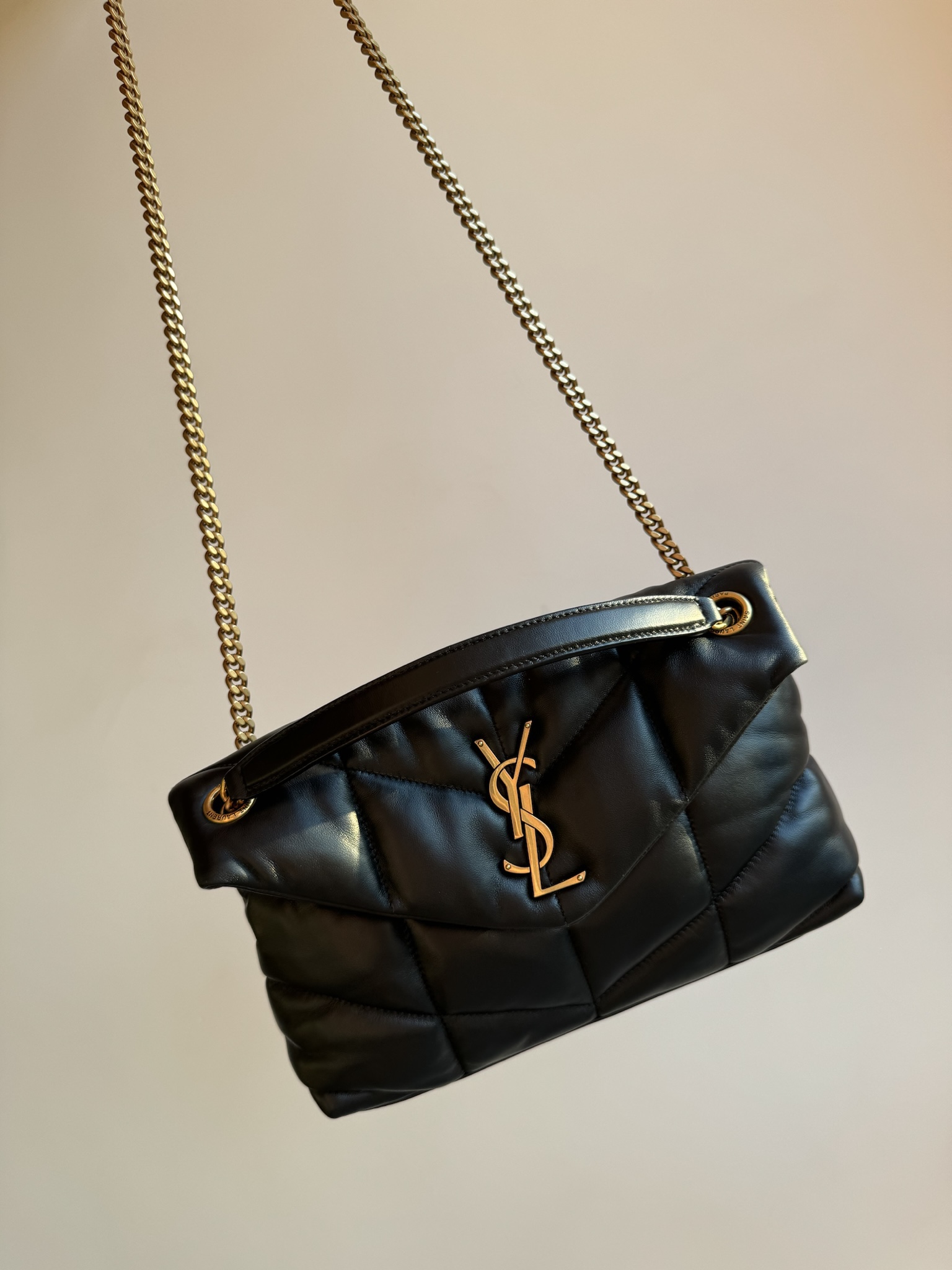 The YSL PUFFER small shoulder bag features ultra-soft lambskin with V-shaped quilted stitching and a YSL logo in antique bronze metal. Magnetic closure and inner zip pocket. Cotton lining. Can be worn crossbody or on the shoulder. Dimensions: 29 x 17 x 11 cm. Chain drop: 28 – 52 cm.