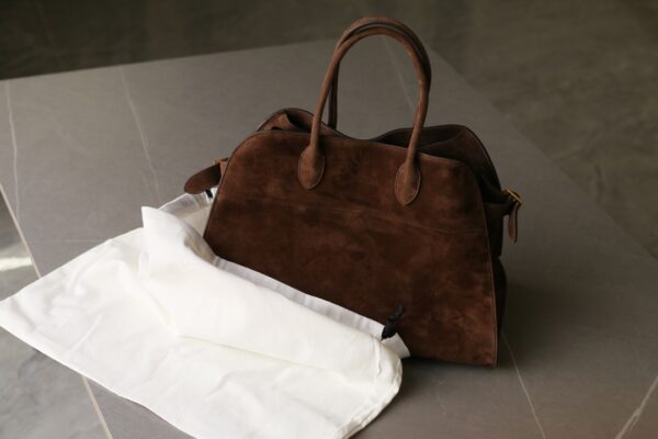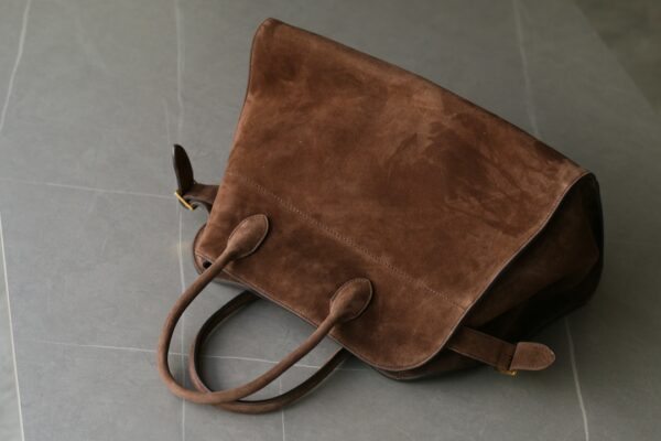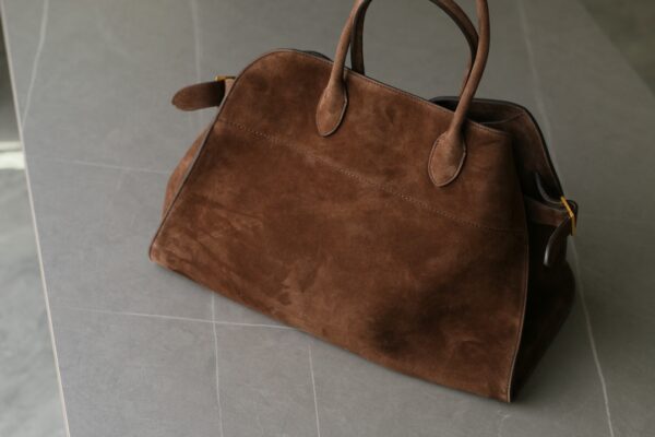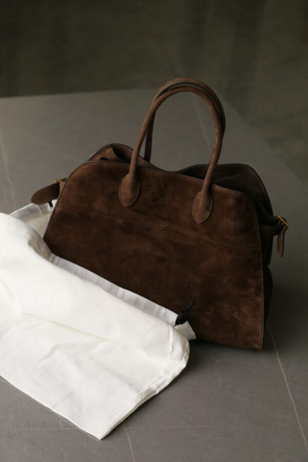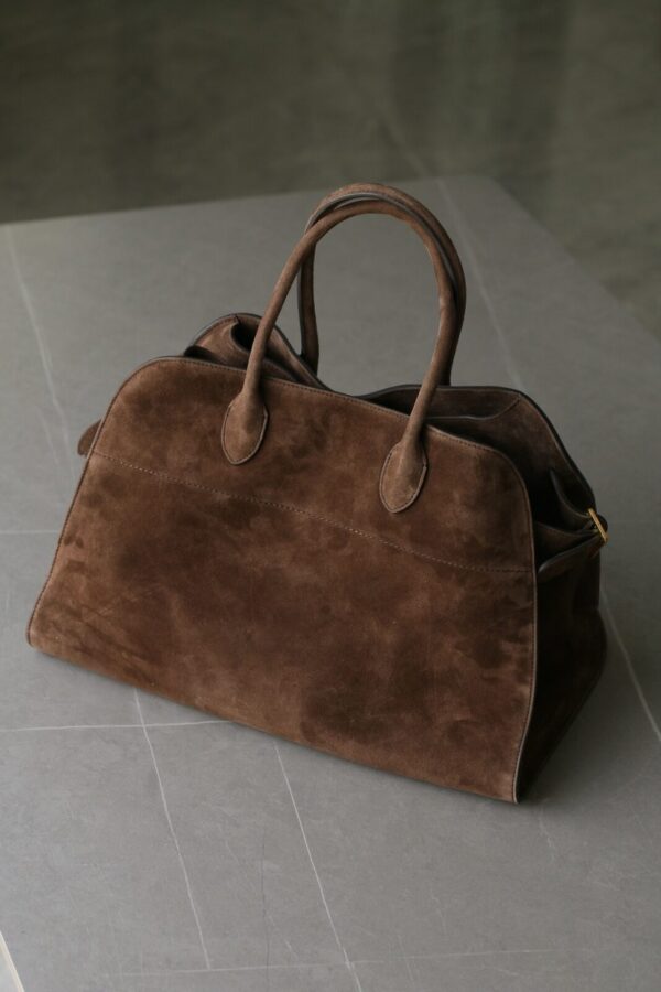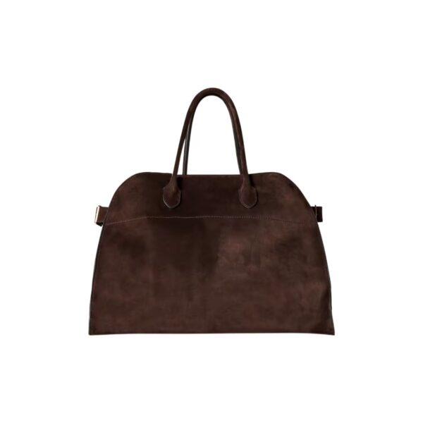 THE ROW Margaux 15 Tote crafted from suede leather with buckle straps and spacious interior. Dimensions: 38.1×22.86×27.94cm.