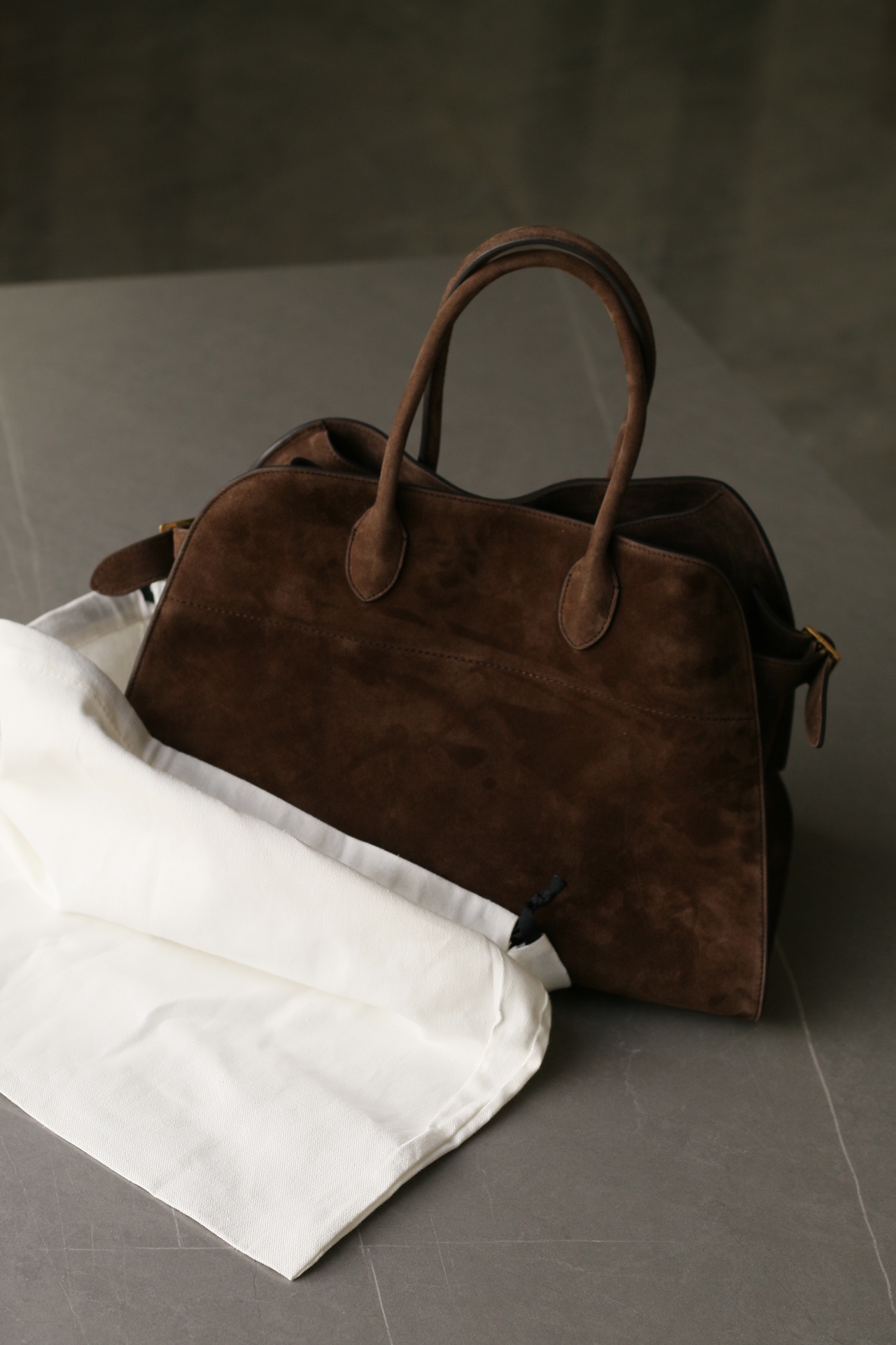 THE ROW Margaux 15 tote in mocha brown suede with buckle closure — structured and elegant.