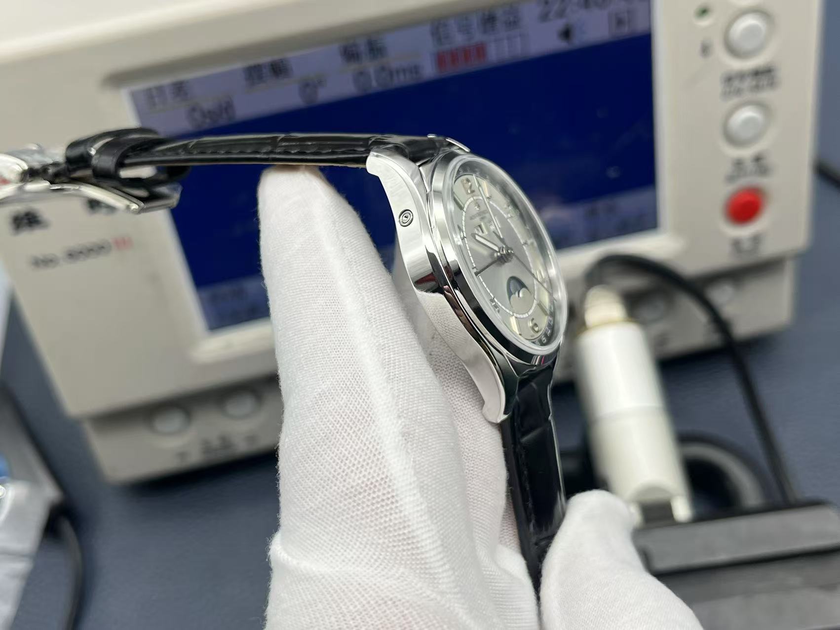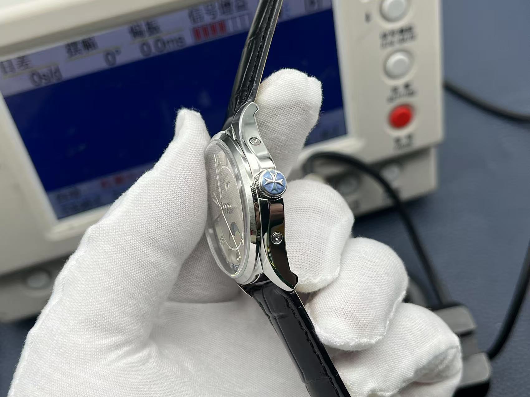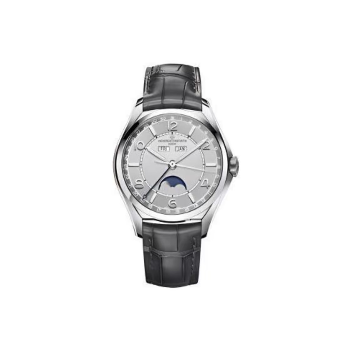 The Fiftysix collection pays tribute to a 1956 classic. This 40mm stainless steel model features polished finishing and box-shaped sapphire crystal. It is powered by the in-house Caliber 2460 QCL/1 automatic movement, displaying day, date, month, and moonphase, offering 40 hours of power reserve. The silver dial is complemented by gold hands and indexes. Completed with a deep blue Mississippi alligator strap, it exudes understated luxury and craftsmanship.